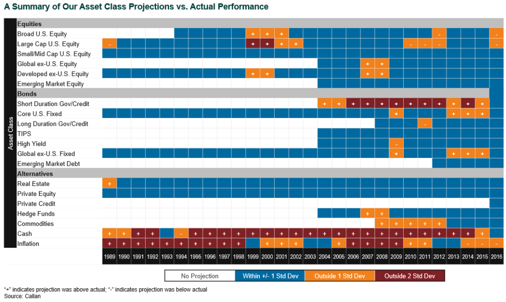 It is on this second score that we will focus today. The question that we often get from clients is, “How have you done in the past when predicting the future of the capital markets?” The short answer is, “not too badly.” The longer answer is shown in the chart below.