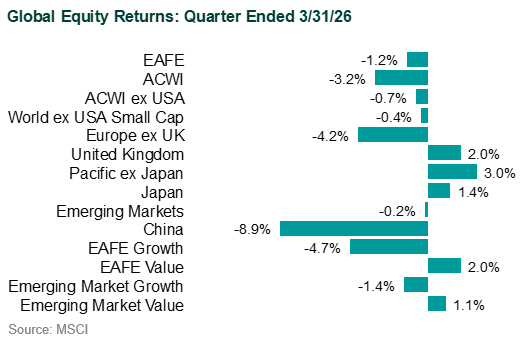 Global equities declined in 1Q26 as rising interest rates and elevated macro uncertainty weighed on risk sentiment, with U.S. equities underperforming non-U.S. markets. Fixed income markets were broadly flat to modestly negative in 1Q26, as rising yields and spread widening offset income. Liquid alternatives delivered strong returns in 1Q26, led by commodities and energy-related assets.